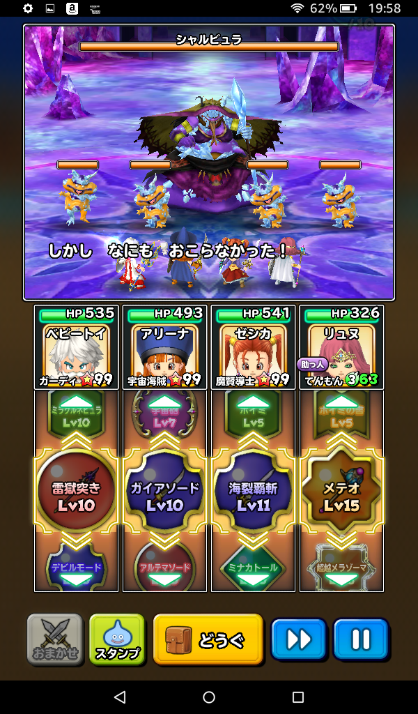 シャルビュラは吹雪の舞、イオナズン、たつまきなどで全体攻撃してきます。