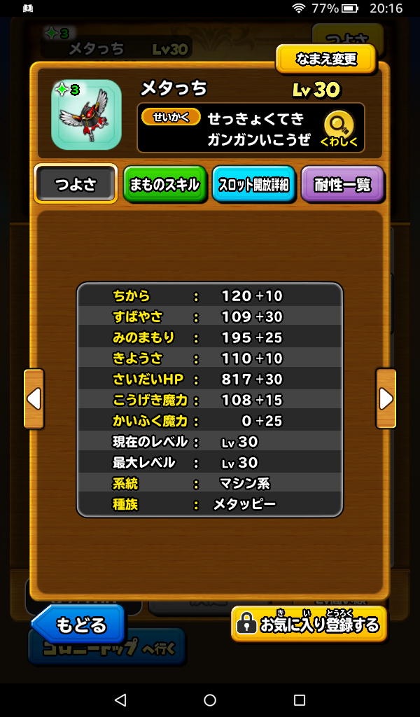 星のドラゴンクエストにおけるモンスター闘技場のメタッピーのLv30ステータスです。