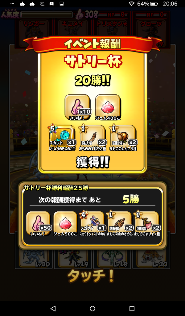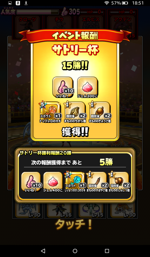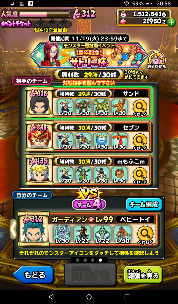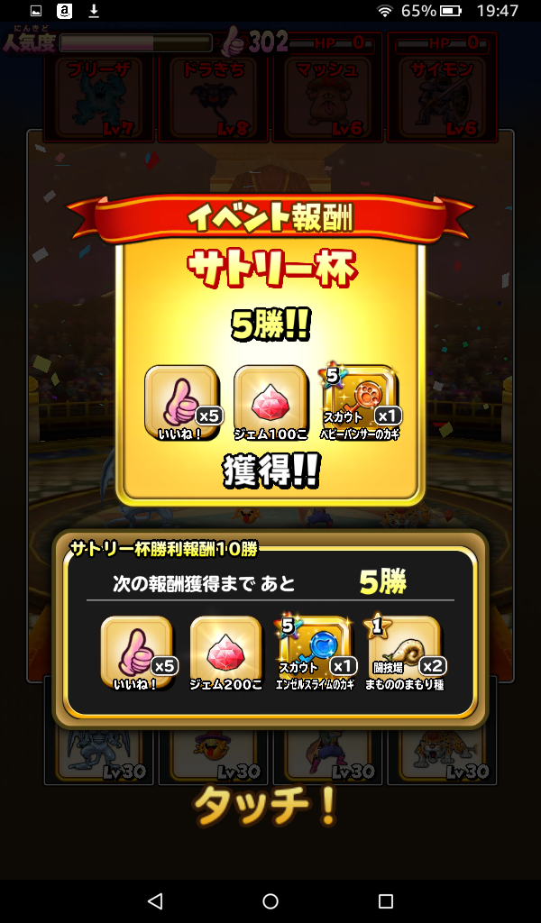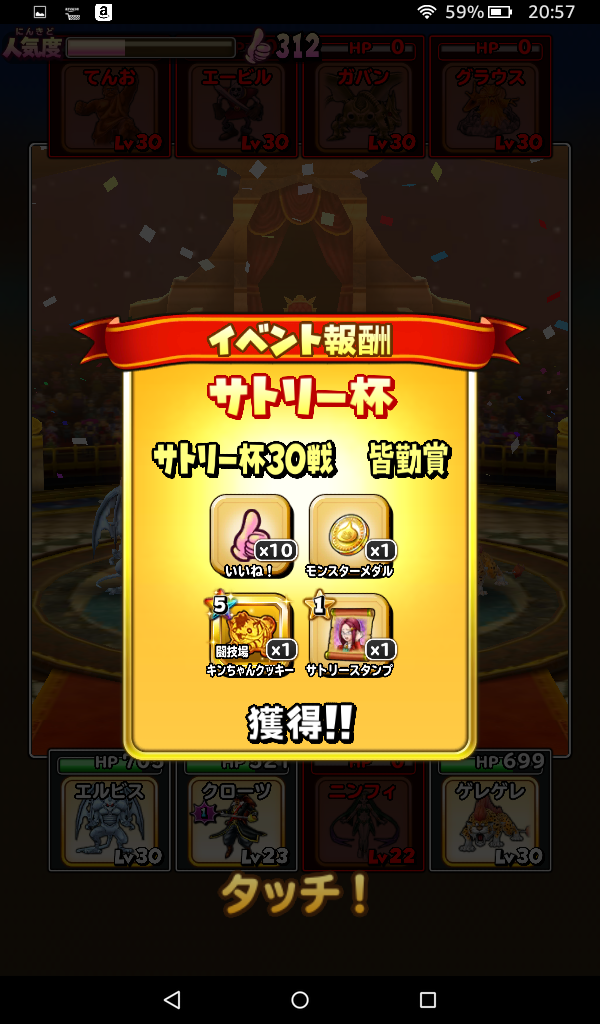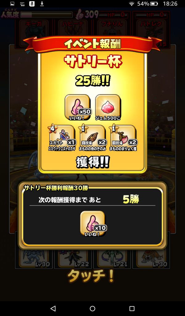 星ドラのモンスター闘技場イベント第1回サトリー杯で30戦達成しましたよ。